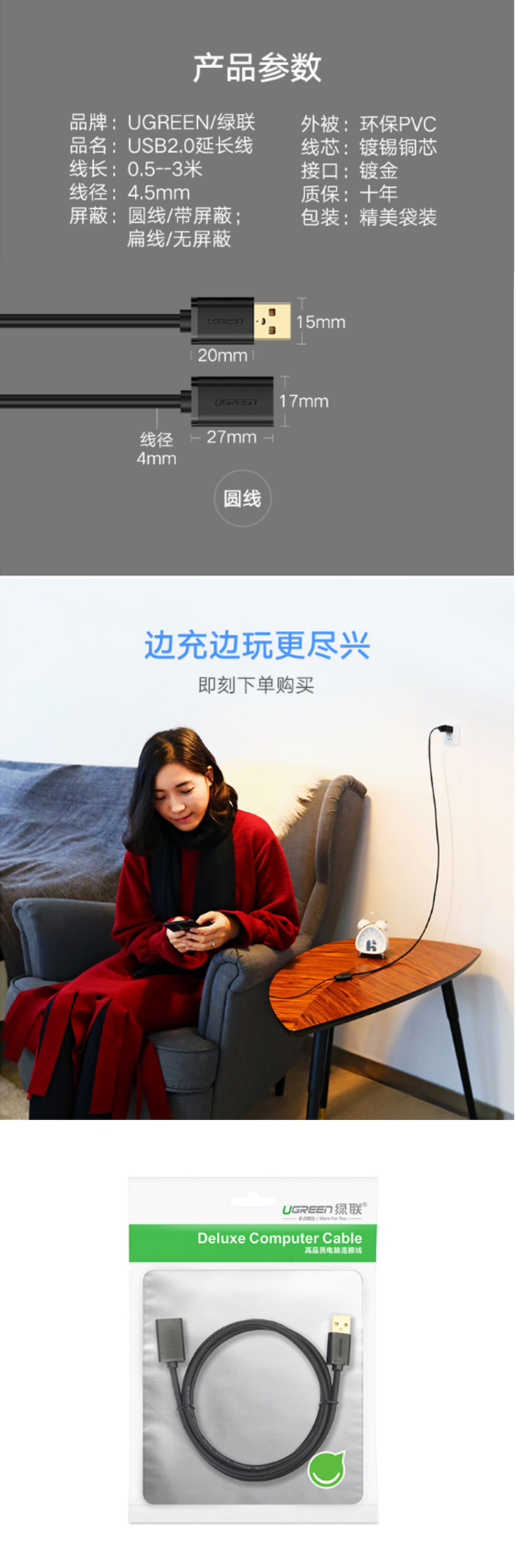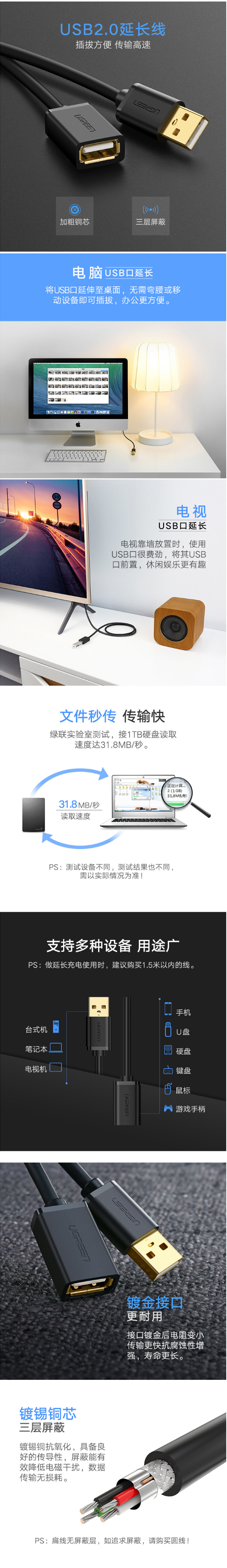 商品名称:绿联 10316 2米 USB2.0延长线公对母 黑色(单位:根)