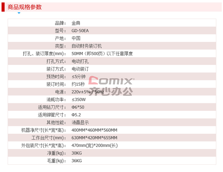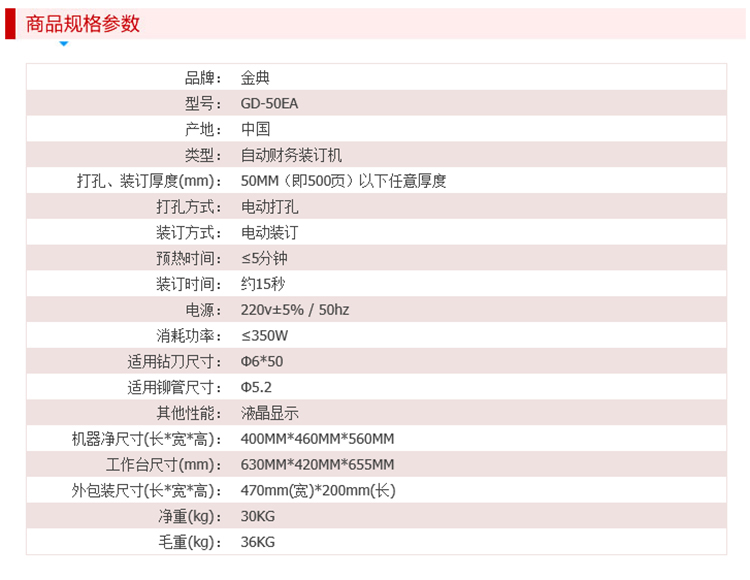 商品名称:金典 GD-50EA 财务凭证装订机 白色(单位:台)
