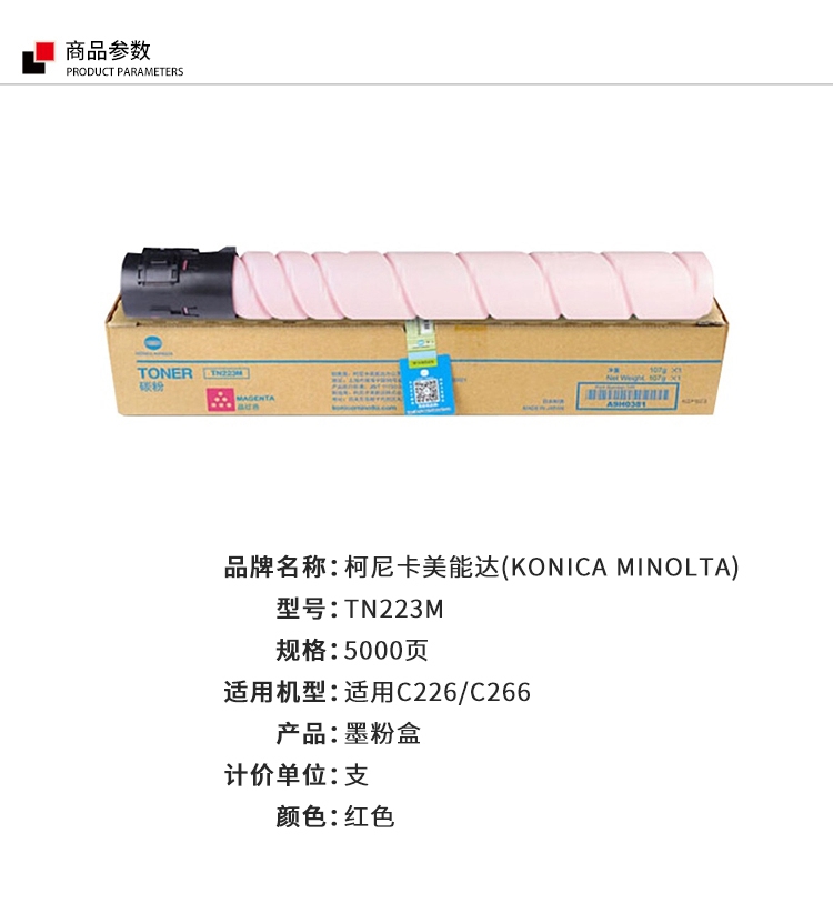 商品名称:柯尼卡美能达 TN223M 墨粉 高容 红色 适用C226/C266 单位: 支