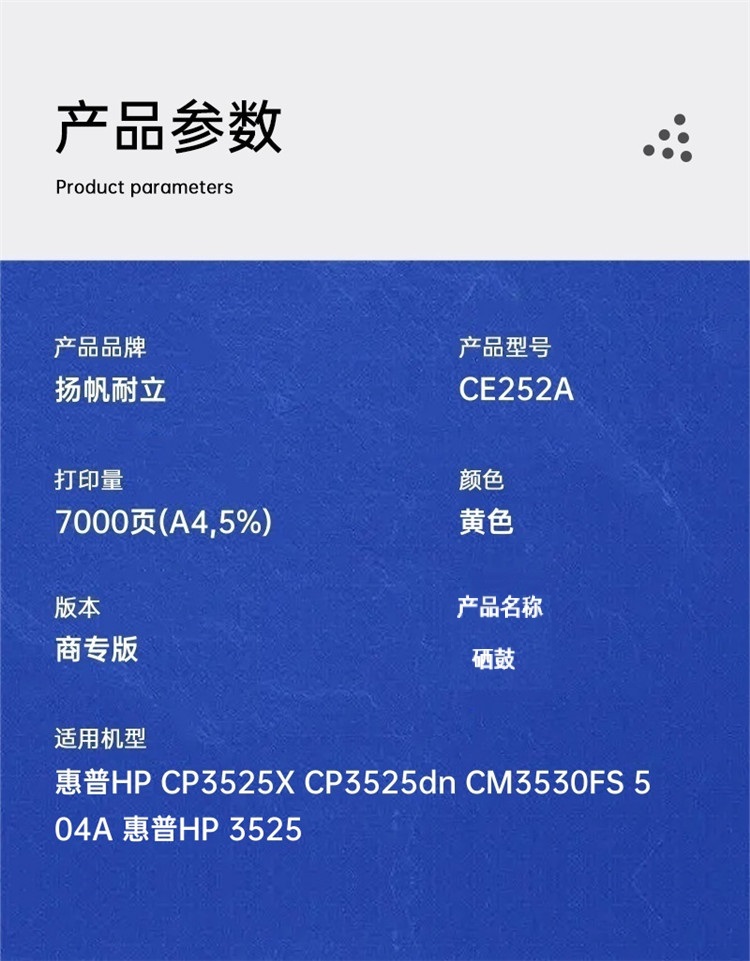 - 商品名称:扬帆耐立 CE252A 商专版 (带芯片)硒鼓 适用型号:惠普HP CP3525X CP3525dn CM3530FS 504A 惠普HP 3525(单位:支)黄色
