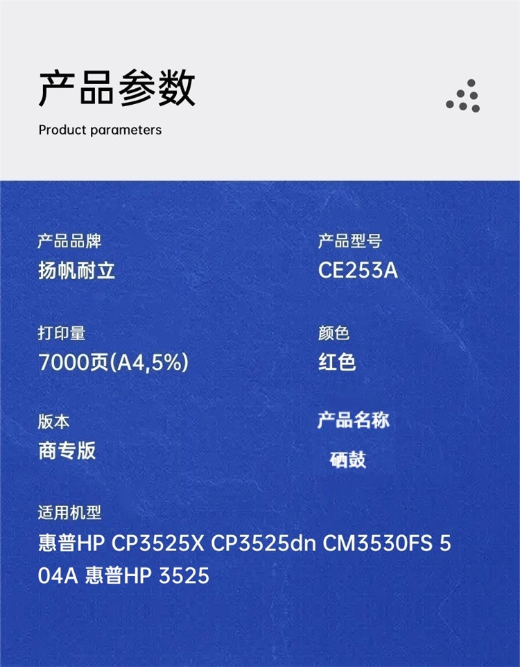 - 商品名称:扬帆耐立 CE253A 商专版 (带芯片)硒鼓 适用型号:惠普HP CP3525X CP3525dn CM3530FS 504A 惠普HP 3525(单位:支)红色