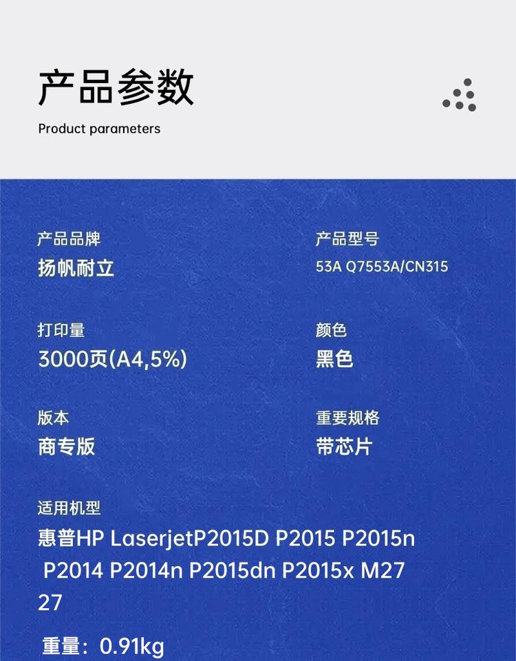 - 商品名称:扬帆耐立 Q7553A/CN315 (带芯片)商专版 硒鼓 适用型号:惠普HP LaserjetP2015D P2015 P2015n P2014 P2014n(单位:支)黑色