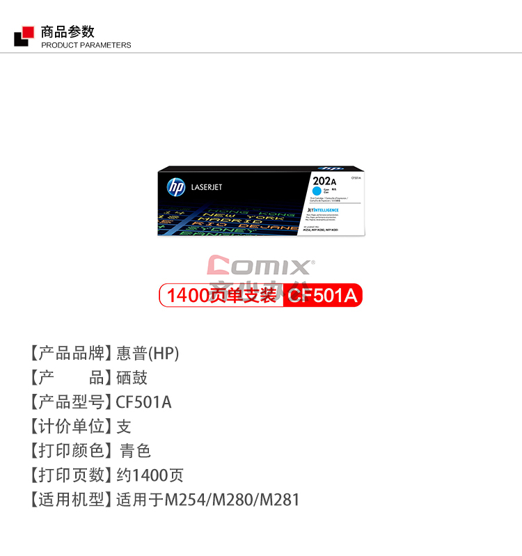 - 商品名称:惠普(HP) CF501A 202A 硒鼓 青色(单位:个)适用:HPColor/LaserJet/Pro/M254系列HPColor/LaserJet/Pro/MFP/M280/M281/系列