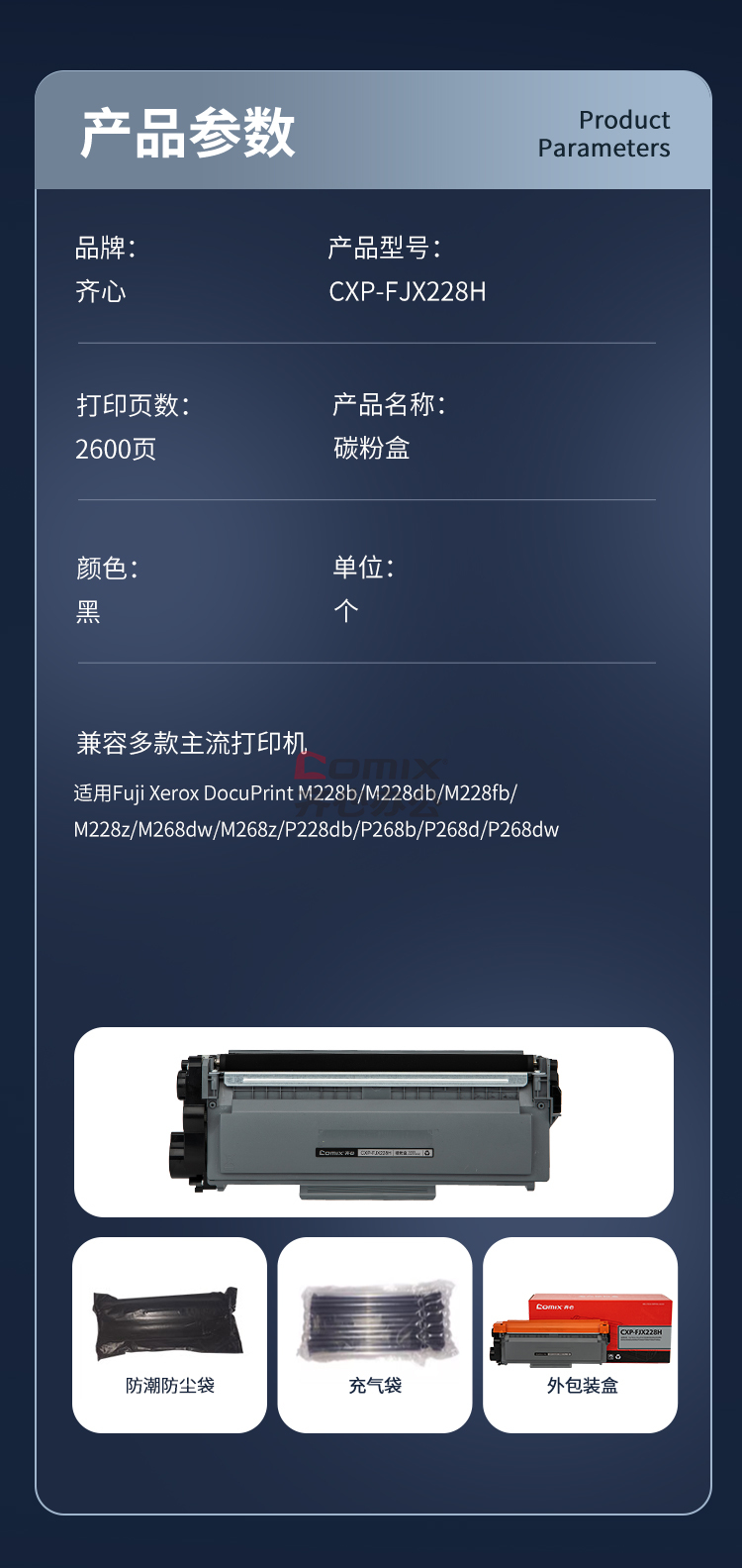 - 商品名称:齐心 CXP-FJX228H 碳粉盒/硒鼓 黑色 单位:个 适用:Fuji Xerox DocuPrint M228b/M228db/M228fb/M228z/M268dw/M268z/P228db/P268b/P268d/P268dw