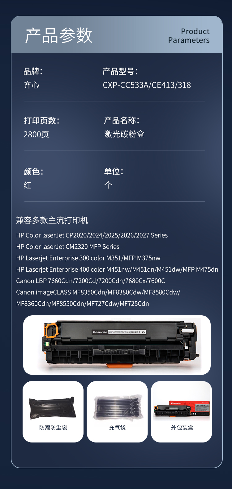 - 商品名称:齐心 CXP-CC533A/CE413/318 激光碳粉盒/硒鼓 红色 单位:个 适用:HP Color laserJet CP2020/2024/2025/ CM2320;HP Laserjet Enterprise 300 color M351/MFP M375nw;Canon LBP 7660Cdn/7200Cd