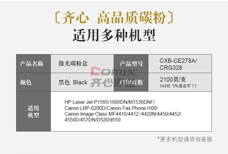 - 商品名称:齐心 CXB-CE278A/CRG328 激光碳粉盒/硒鼓 黑色 单位:个 适用:HP Laser Jet P1566/1606DN/M1536DNF/;Canon LBP-6200D