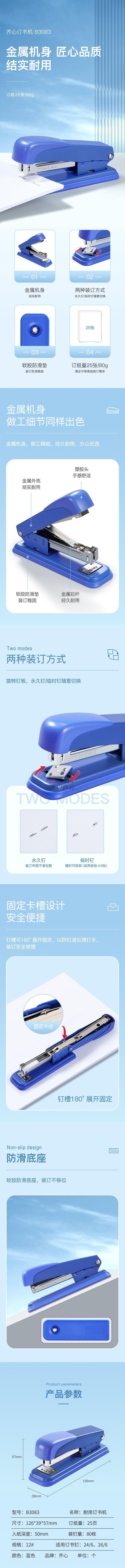 商品名称:齐心 B3083 耐用订书机 12# 25页 蓝色 单位:个