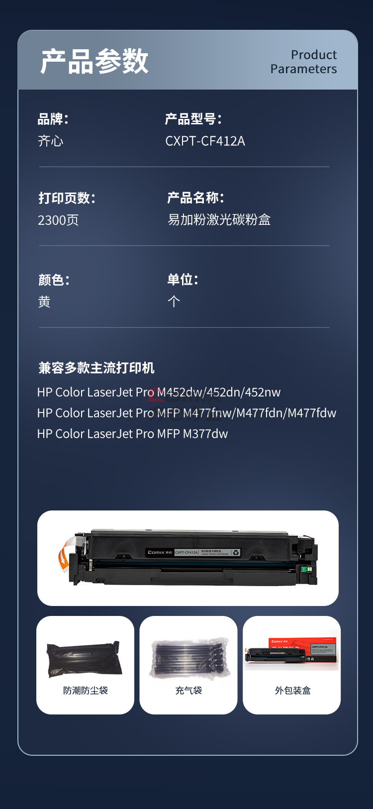 - 商品名称:齐心 CXPT-CF412A 易加粉激光碳粉盒/硒鼓 黄色 单位:个 适用:HP Color LaserJet Pro M452dw/452dn/452nw;MFP M477fnw/M477fdn/M477fdw/MFP M377dw