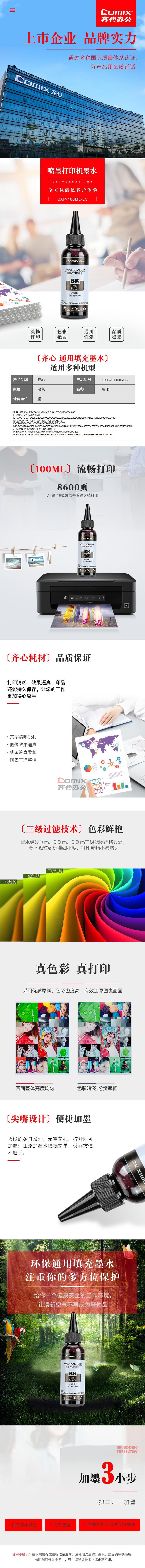 齐心 CXP-100ML-BK 打印机墨水 黑色 单位:瓶 适用:Epson/Canon/Hp/Brother系列桌面打印机