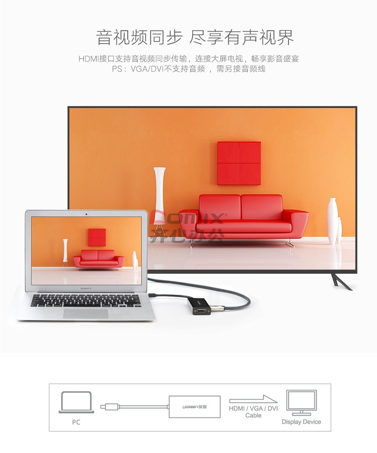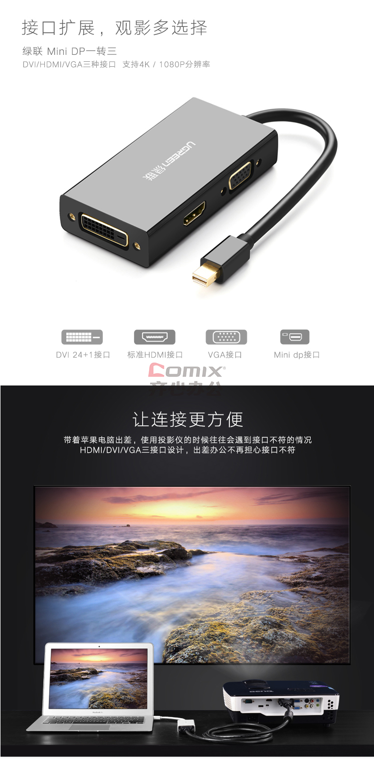 绿联 20418 DP转HDMI/VGA/DVI三合一转换器 苹果4K 音视频连接线 (单位:个)