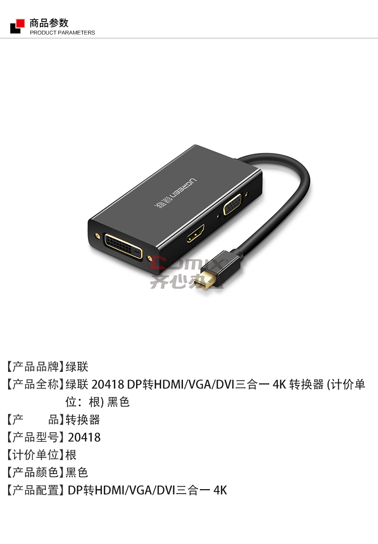 商品名称:绿联 20418 DP转HDMI/VGA/DVI三合一转换器 苹果4K 音视频连接线 (单位:个)