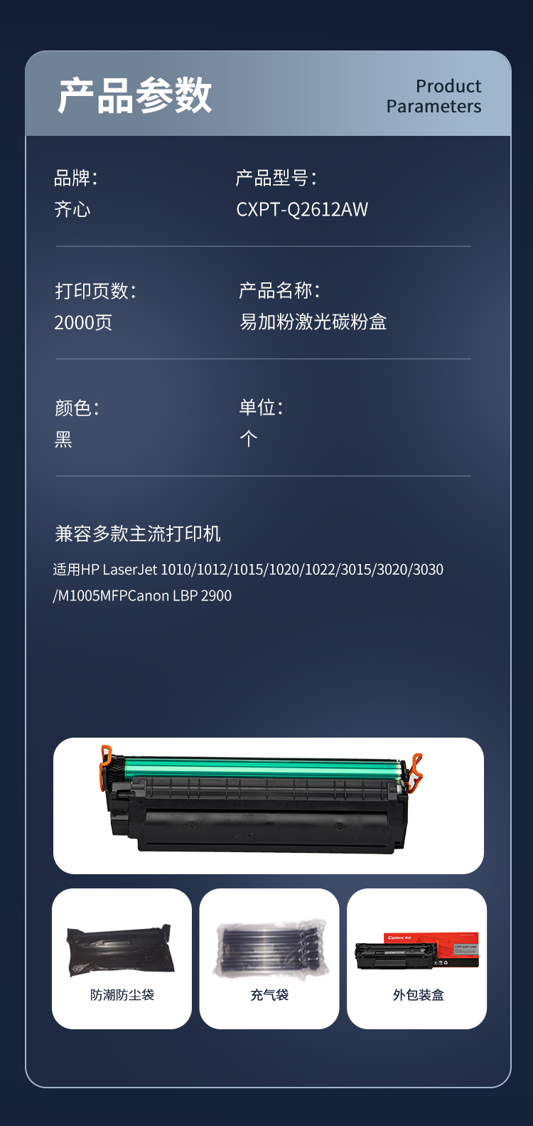 - 商品名称:齐心 CXPT-Q2612AX 易加粉激光碳粉盒/硒鼓 黑色 单位:个 适用:HP LaserJet 1010/1012/1015/1020/1022/3015/3020/3030/M1005MFP;Canon LBP 2900