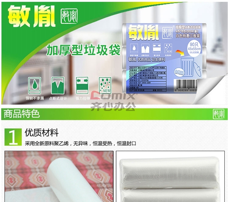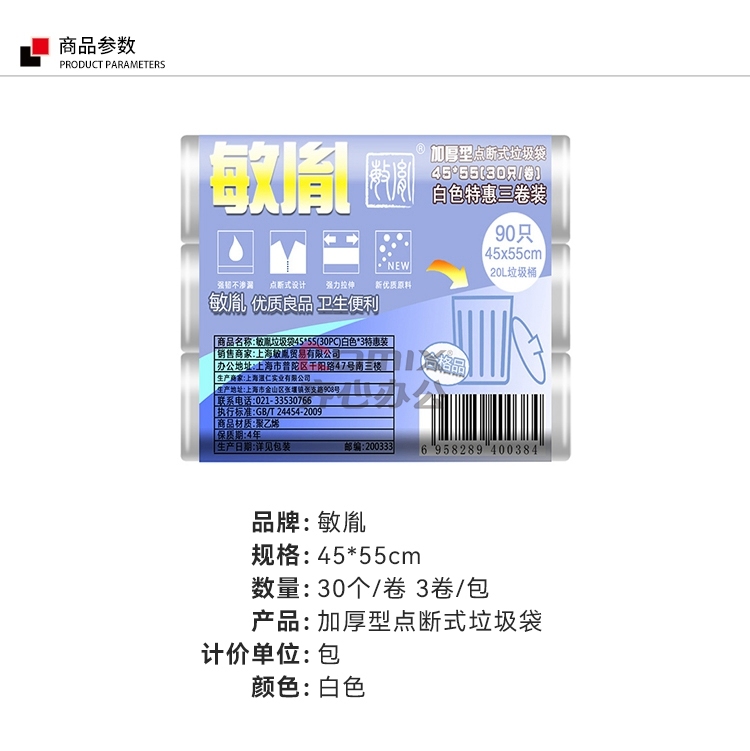 商品名称:敏胤 45*55cm 垃圾袋 30只*3卷/包(计价单位:包)白色