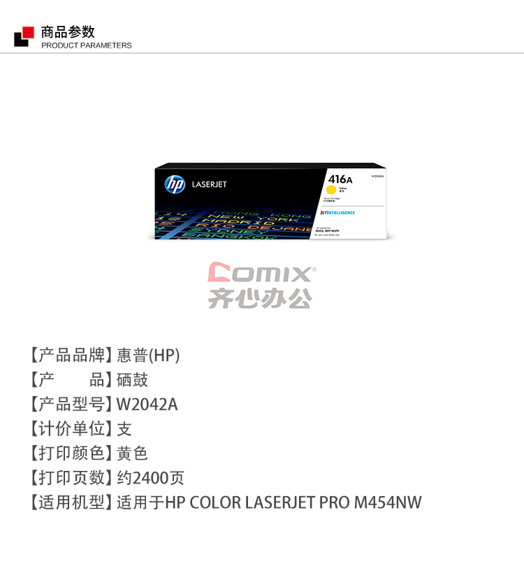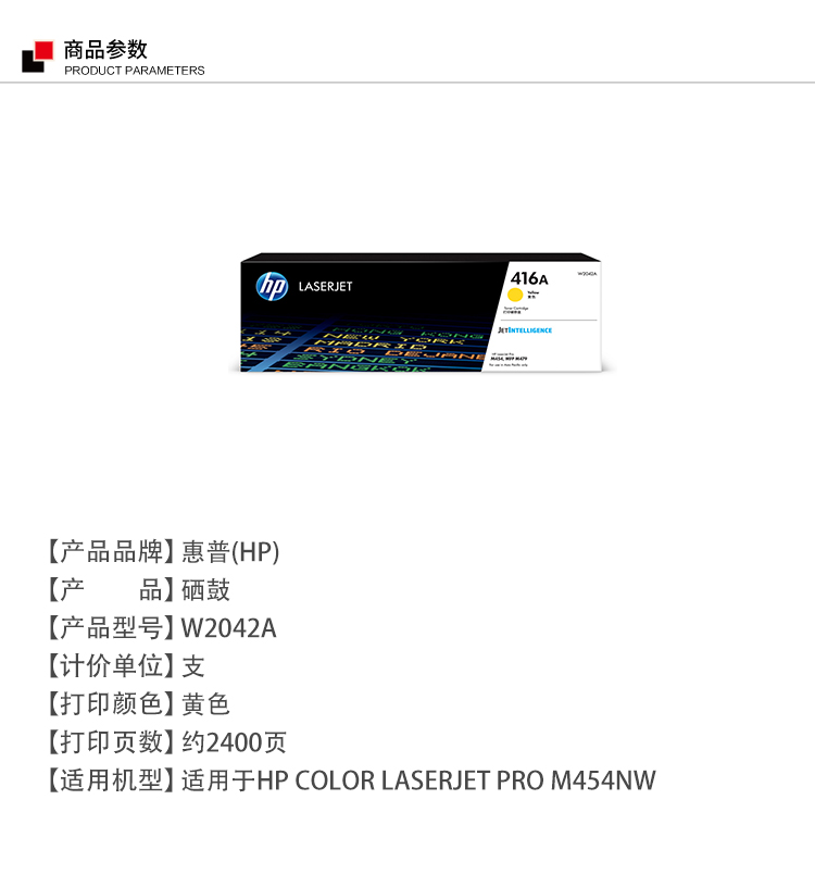 商品名称:惠普 W2042A 416A 硒鼓 黄色 (单位:个) 适用机型:m454dw/m479dw/m479fd