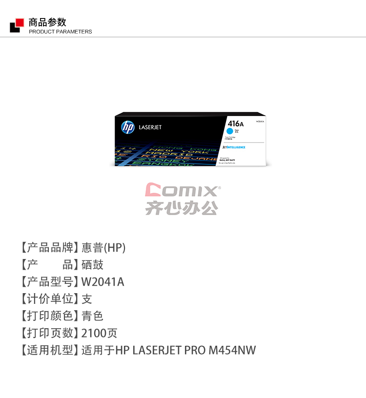 商品名称:惠普 w2041A 416A 硒鼓 青色 (单位:个) 适用机型:m454dw/m479dw/m479fd