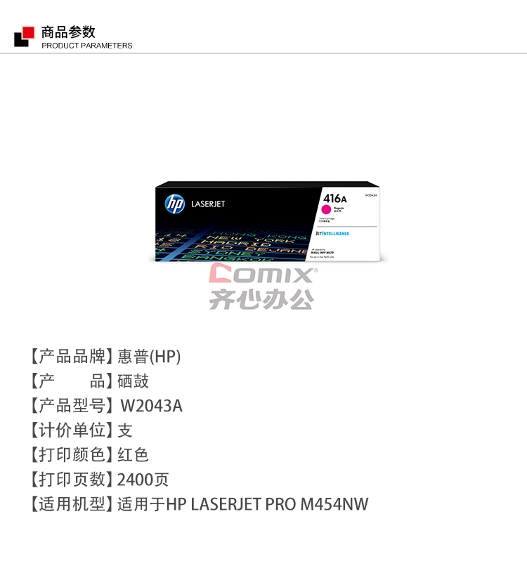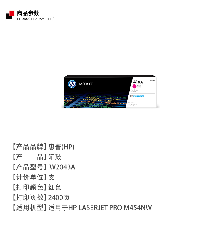 商品名称:惠普 W2043A 416A 硒鼓 红色 (单位:个) 适用机型:m454dw/m479dw/m479fd