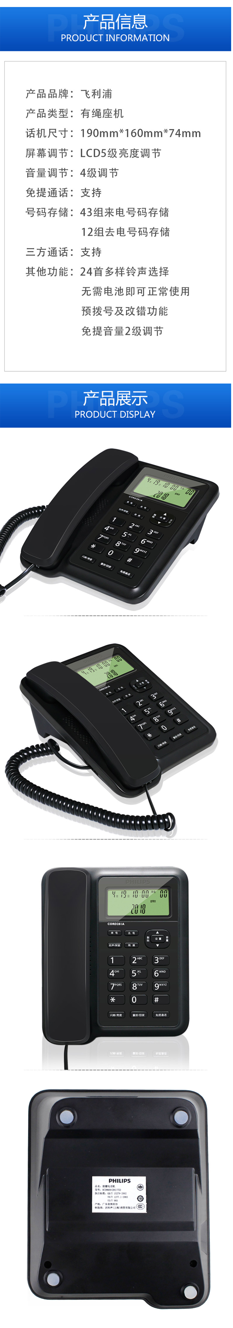 商品名称:飞利浦(PHILIPS) CORD281A 双接口 电话机座机 免电池 黑色 (单位:部)