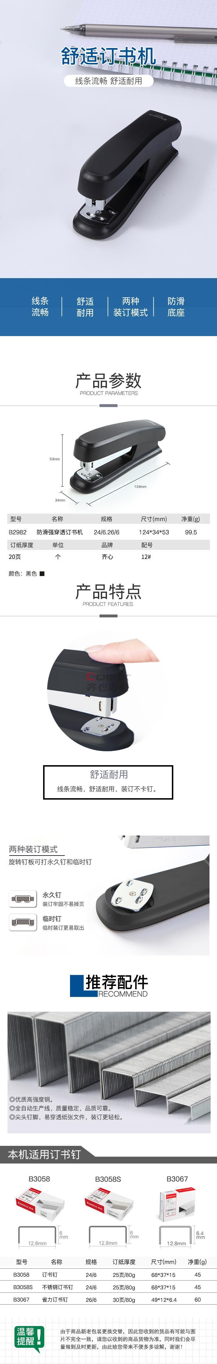 商品名称:齐心 B2982 防滑强穿透订书机 12# 20页 黑色 单位:个
