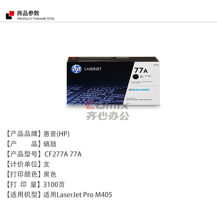 - 商品名称:惠普(HP) CF277A 77A 硒鼓 黑色 (单位:个) 适用机型:HP/LaserJetProM405系列/MFP/M429系列