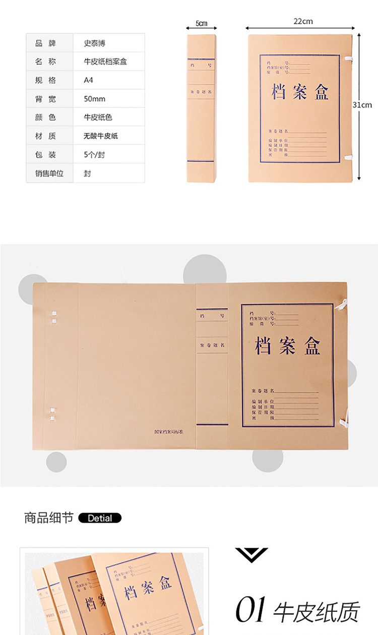 商品名称:史泰博 A4 5cm 牛皮纸 档案盒 5.00 个/封 (计价单位:封) 牛皮纸色