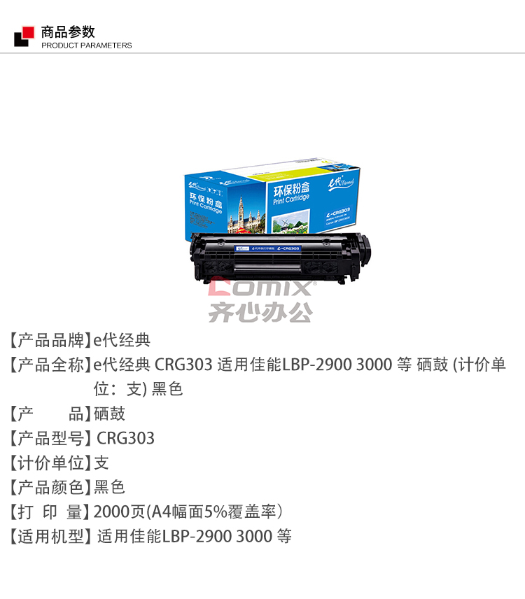 - 商品名称:e代经典 CRG303 硒鼓 适用佳能LBP-2900 3000 惠普HP1012 1015 1020 M1005MFP/303 单位:个