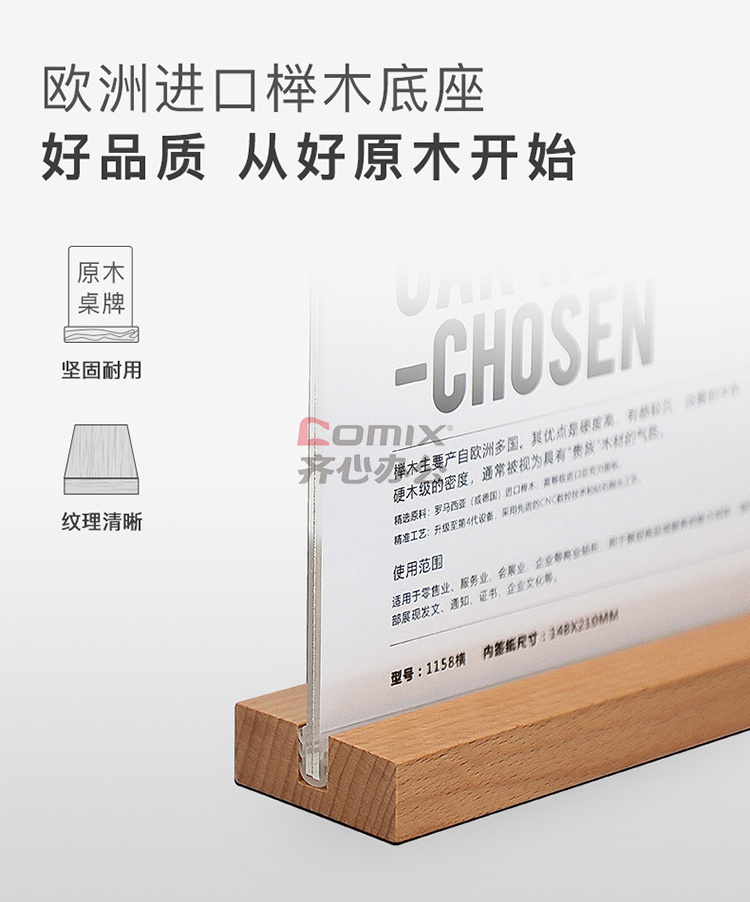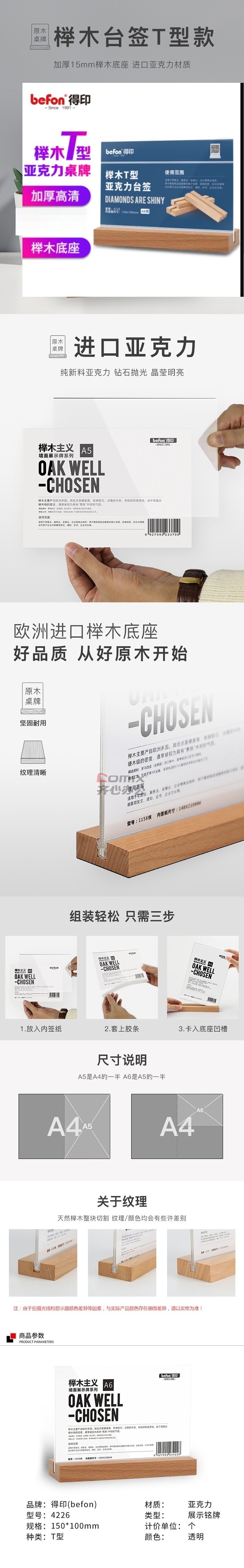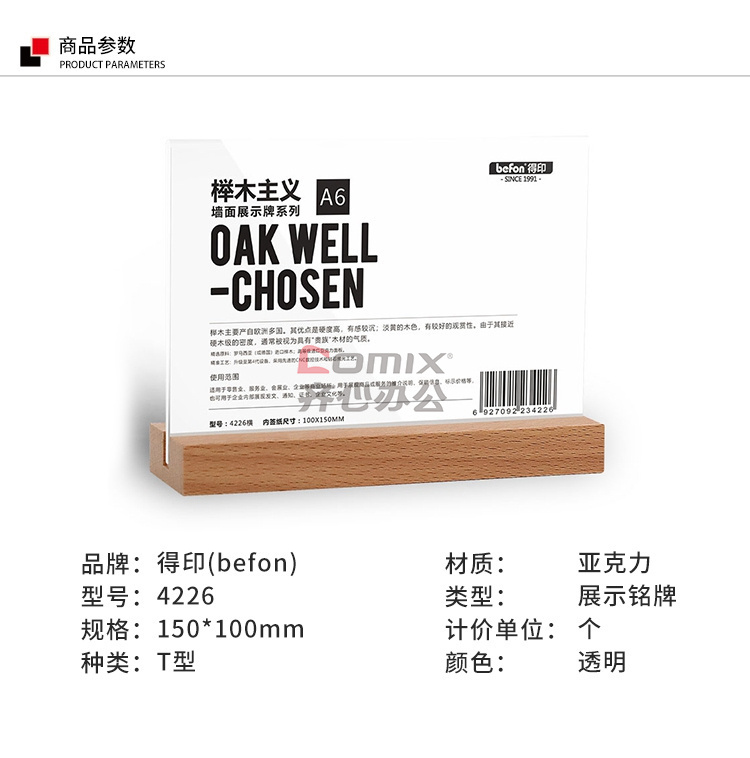 商品名称:得印 4226 精致榉木T型亚克力桌牌桌牌架台签 150*100mm 透明 单位:个
