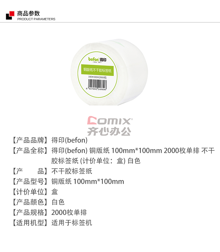 - 商品名称:得印(befon) 铜版纸100mm*100mm*2000枚单排 不干胶标签纸(计价单位:卷)
