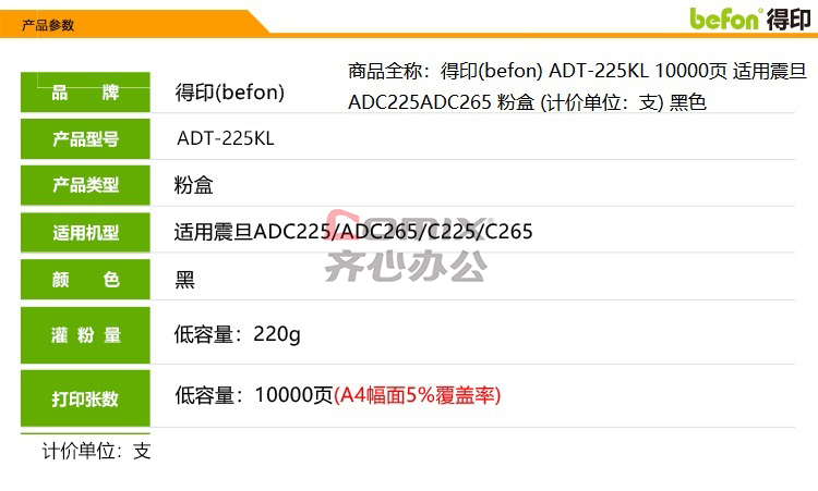 商品名称:得印(befon) ADT-225KL粉盒 碳粉(计价单位:支)黑色