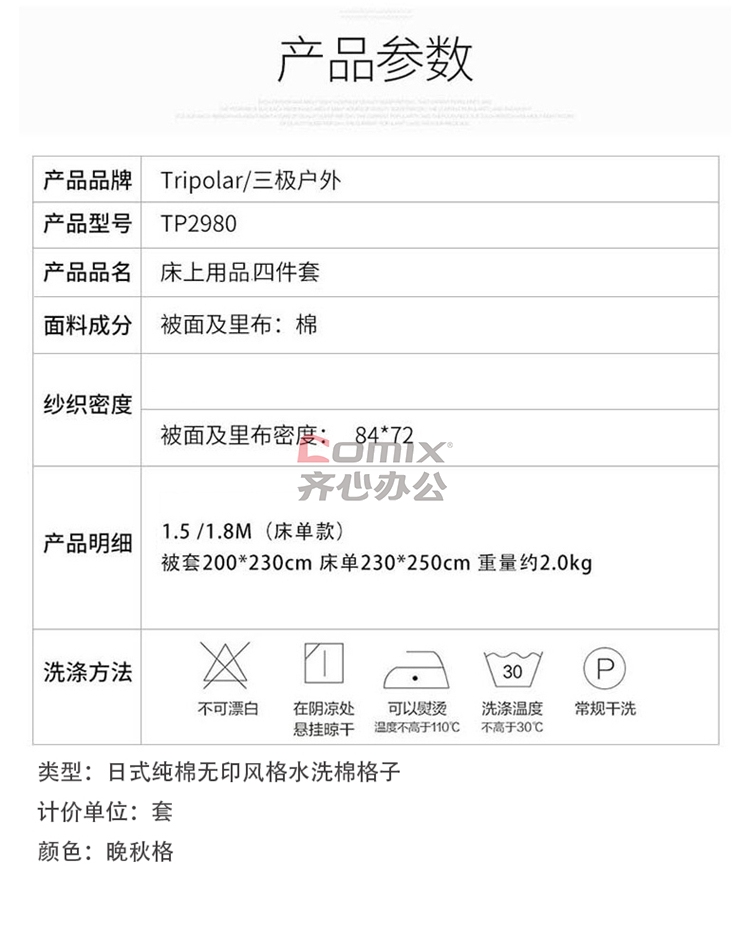 商品名称:三极户外 TP2980 1.5/1.8M(床单款) 日式纯棉无印风格水洗棉格子四件套 (单位:套) 晚秋格