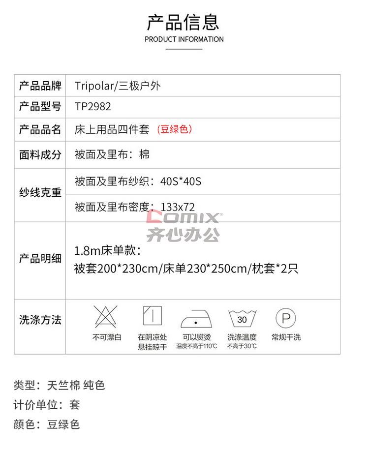 商品名称:三极户外 TP2982 1.8m床单款 天竺棉日式纯色四件套 (单位:套) 豆绿色