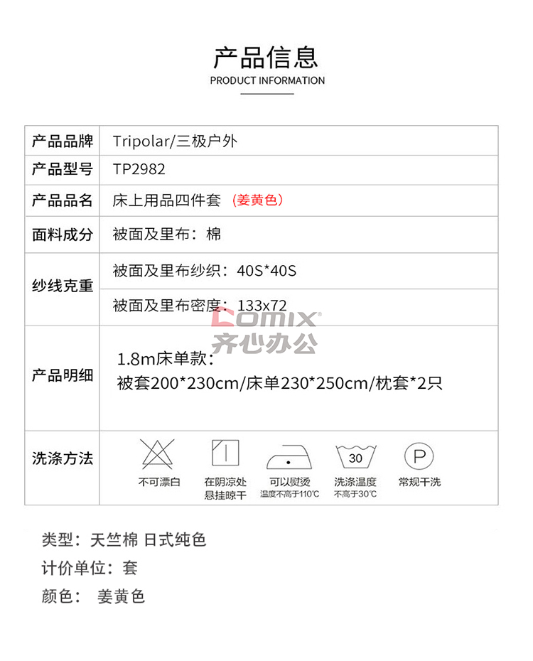 商品名称:三极户外 TP2982 1.8m床单款 天竺棉日式纯色四件套 (单位:套) 姜黄