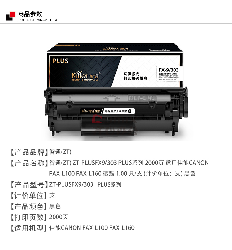 - 商品名称:智通 ZT-CN-FX9/303 PLUS版 打印量2000页 硒鼓 适用机型:佳能Canon FAX-L100 黑色(单位:支)