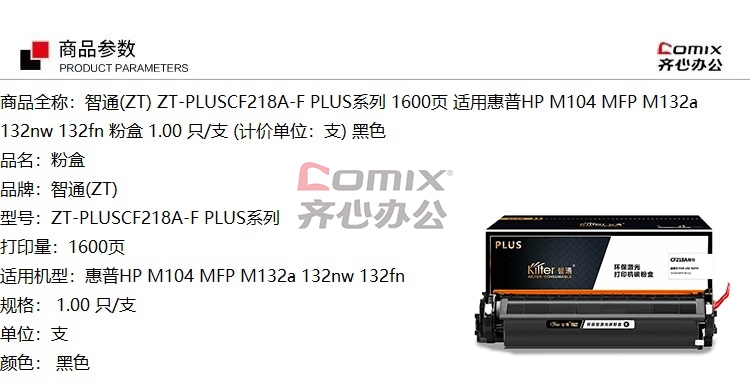 - 商品名称:智通 ZT-CF218A-F PLUS版 打印量1600页 粉盒 适用机型:惠普HP M104 MFP M132a 黑色(单位:支)