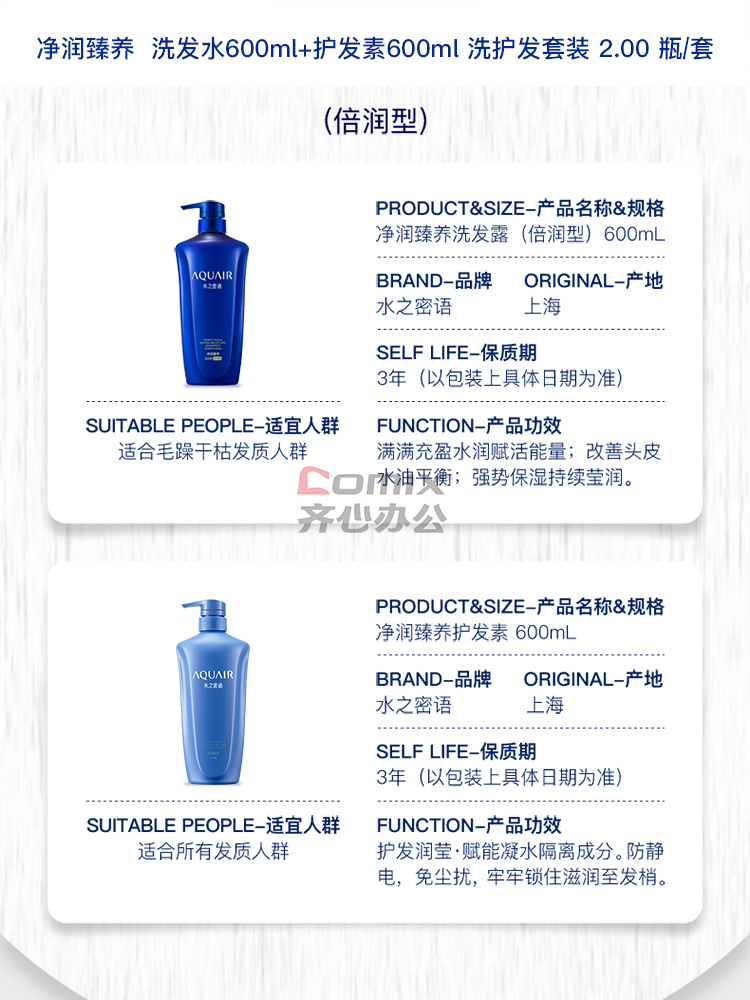商品名称:水之密语(AQUAIR) 净润臻养 倍润型 洗发水600ml+护发素600ml 洗护发套装 2.00 瓶/套 (计价单位:套)