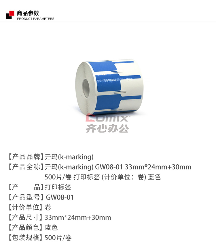 - 商品名称:开玛(k-marking) GW08-01 33mm*24mm+30mm 500片/卷 打印标签 (单位:卷) 蓝色