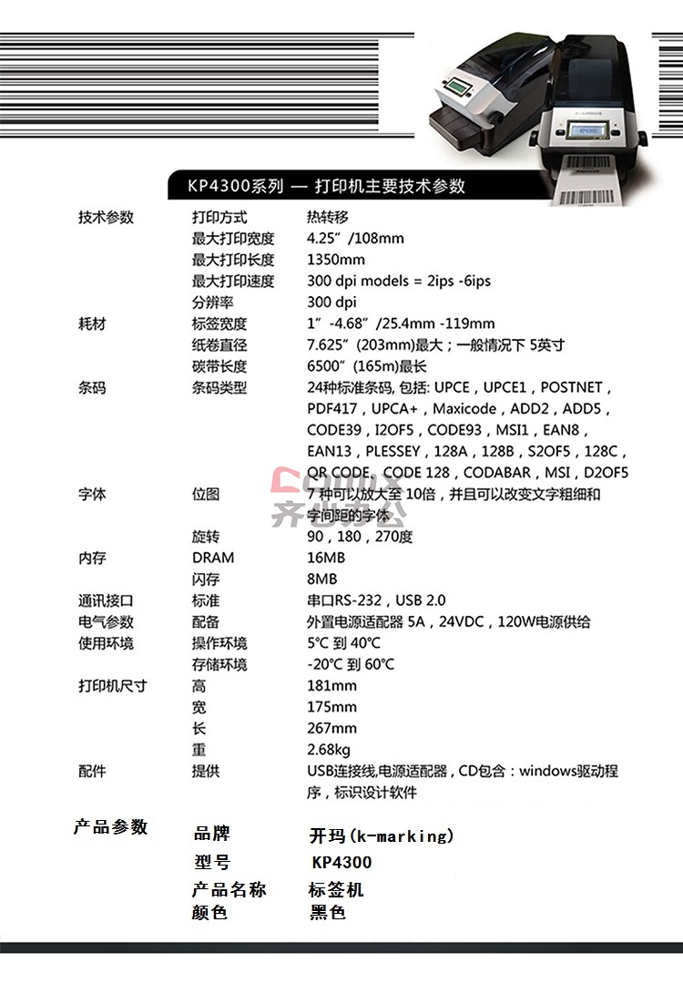 商品名称:开玛(k-marking) KP4300 标签机 (单位:台)