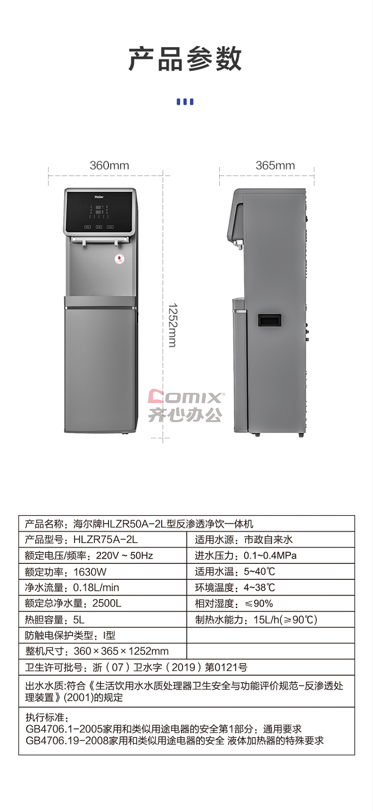 商品名称:海尔(Haier)HLZR75A-2L 1630W商用净水器净饮一体机(单位:台)