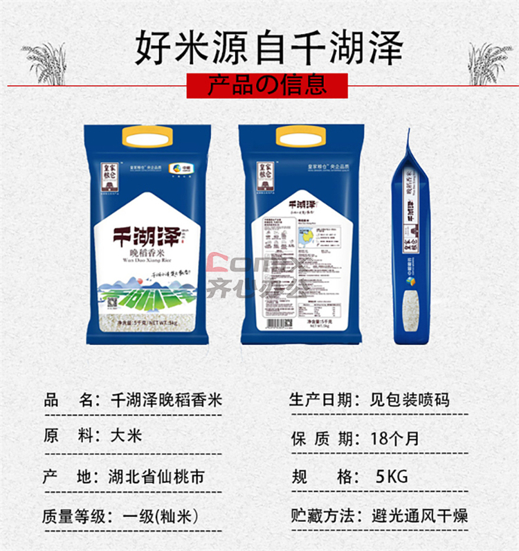 商品名称:中粮 5kg 皇家粮仓千湖泽晚稻香米(单位:袋)