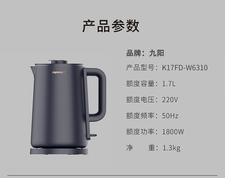 商品名称:九阳 K17FD-W6310 1.7L无缝内胆双层锁温防烫 热水壶(单位:个)