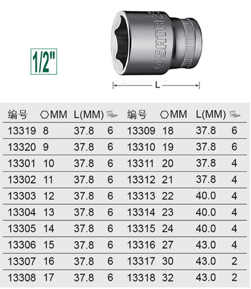 商品名称:世达 12.5MM系列公制6角套筒 SATA-13304 13mm 单位:套
