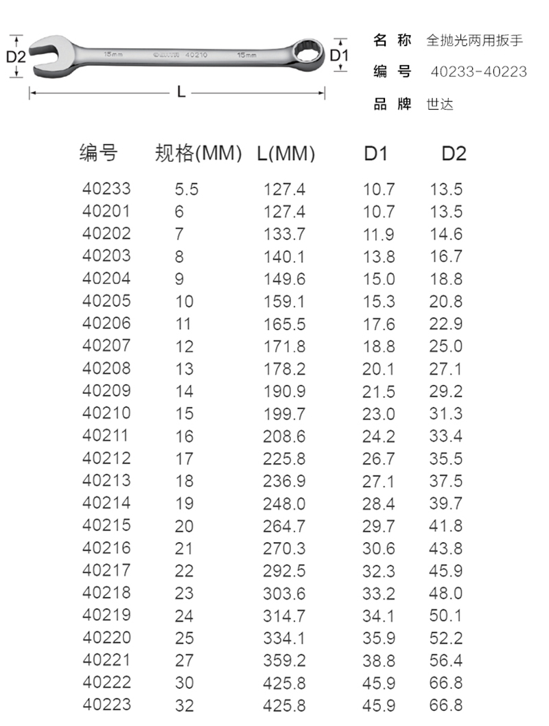 商品名称:SATA/世达 公制全抛光两用扳手 SATA-40201 6mm 单位:个