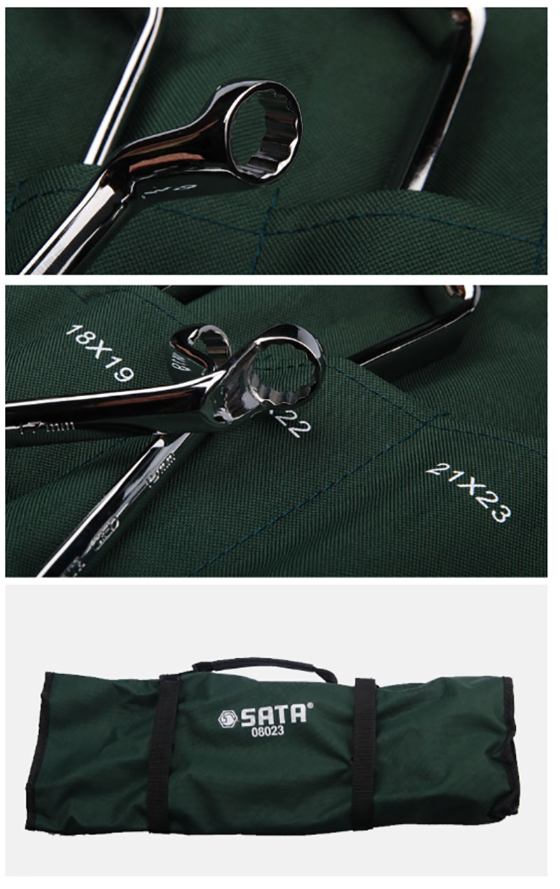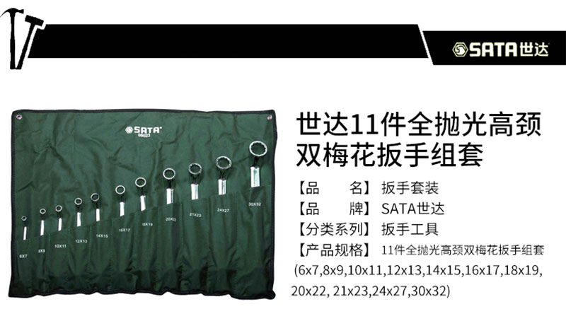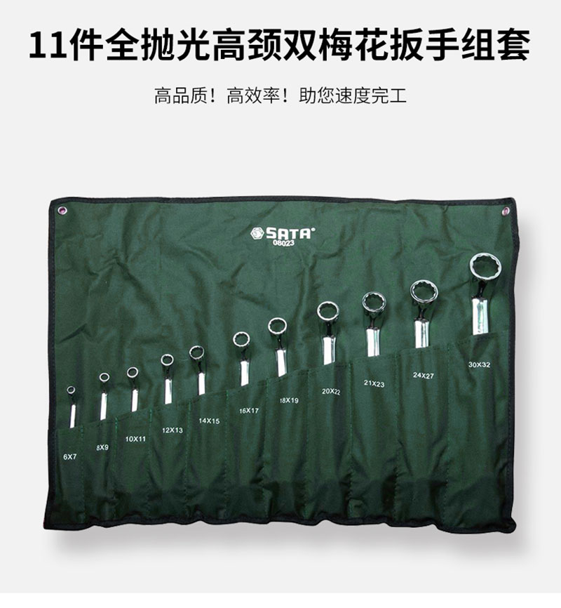 商品名称:世达 公制全抛光高颈双梅花扳手组套 SATA-08023 11件 6-32mm 挂袋 单位:套