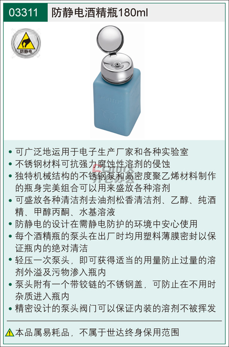 商品名称:世达 防静电酒精瓶 SATA-03311 180ML 实际产品标200ML 单位:个